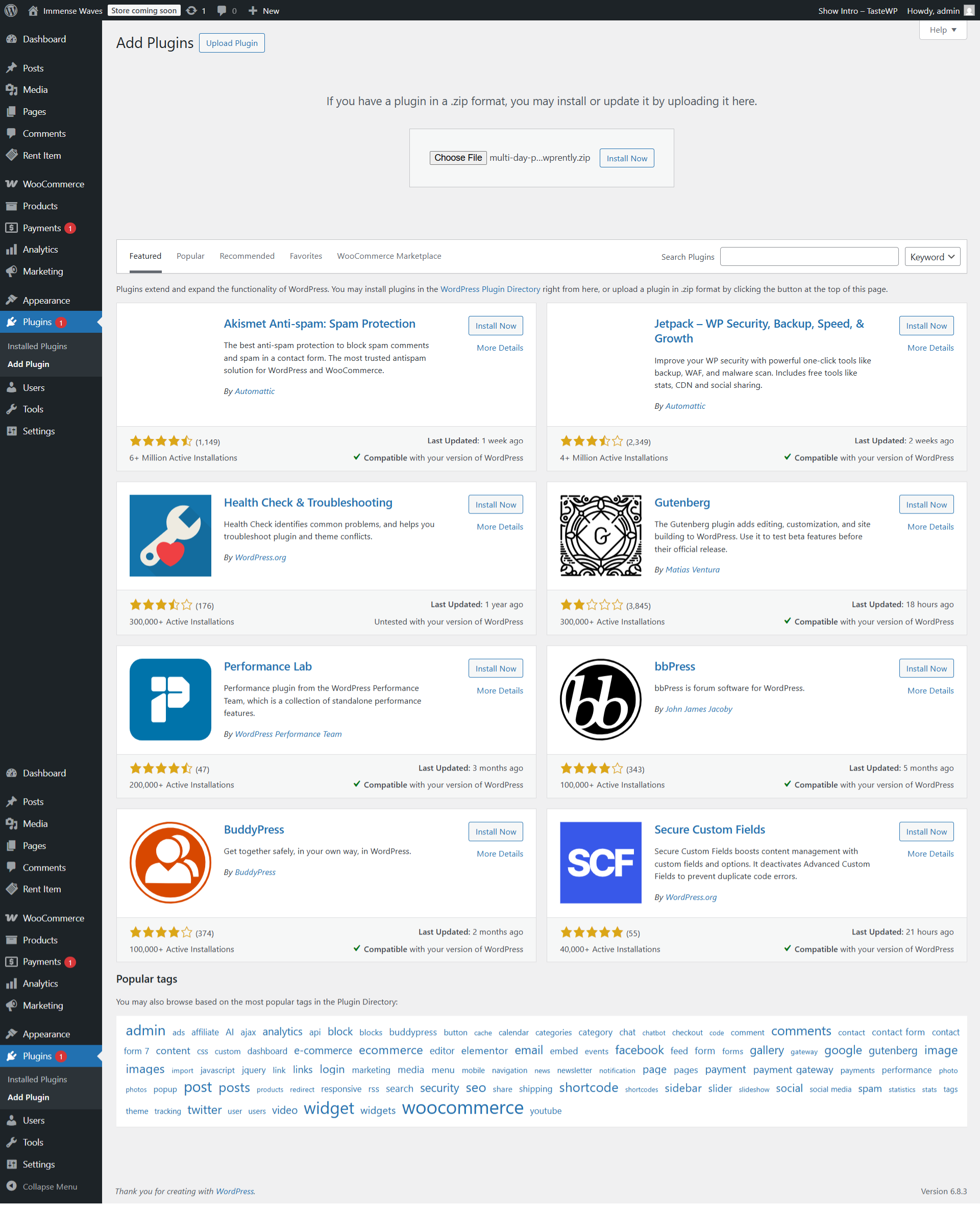 Go to WP Admin > Plugins > Add New > Upload Plugin. Select the multi-day-wprently.zip file and click Install Now.