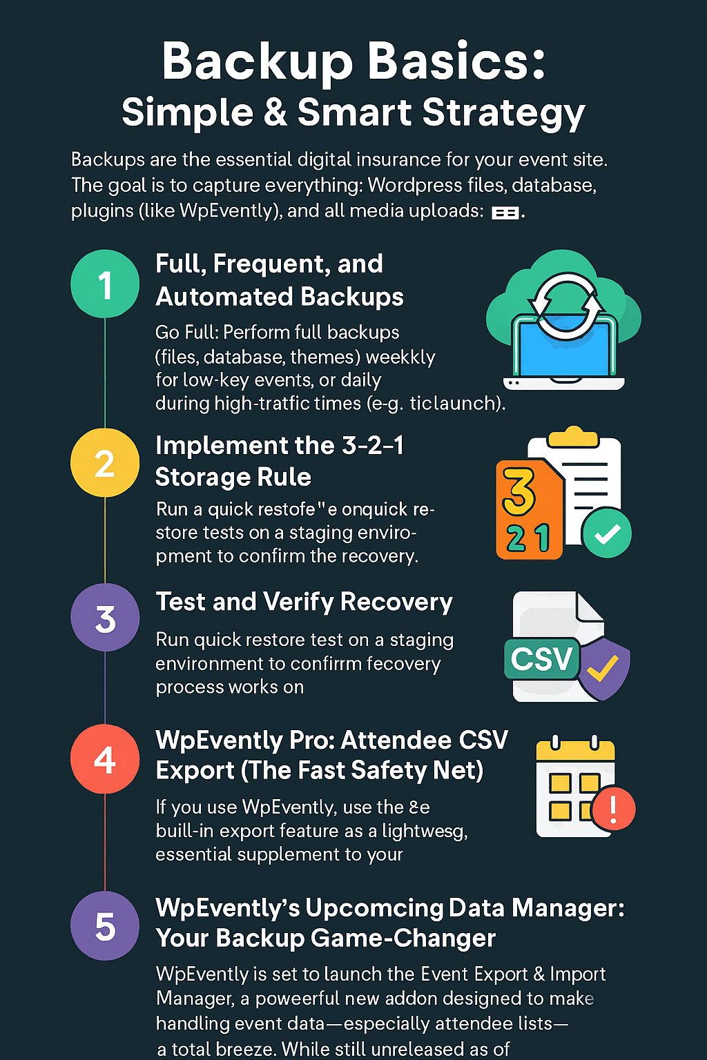 Backups are the essential digital insurance for your event site. The goal is to capture everything: WordPress files, the database, plugins (like WpEvently), and all media uploads.