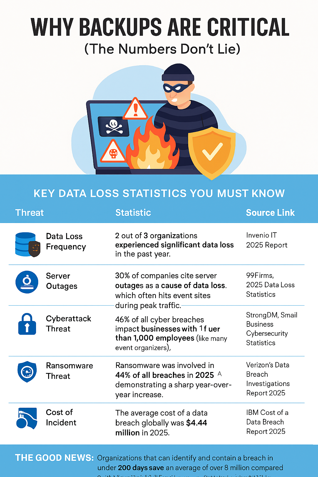 | Server Outages | 30% of companies cite server outages as a cause of data loss, which often hits event sites during peak traffic. | 99Firms, 2025 Data Loss Statistics |