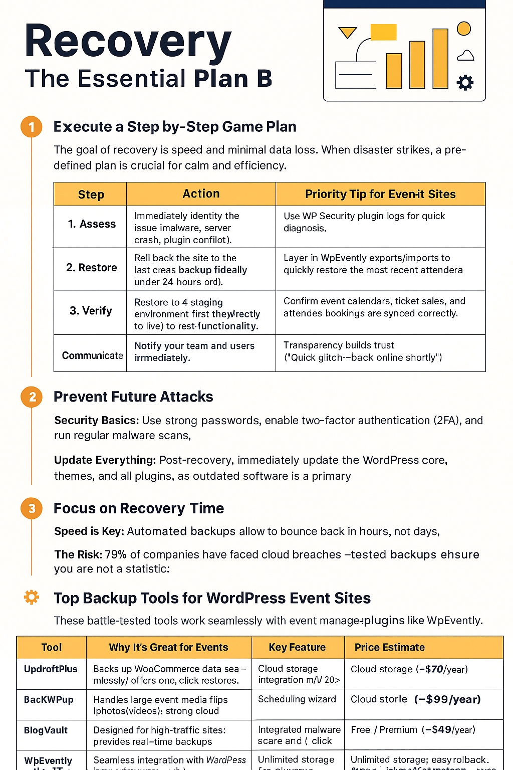This guide is your straightforward, zero-fluff checklist for backing up and recovering your event management website. We’ll cover essential, easy-to-implement tips to help you protect critical data (like WooCommerce ticket sales) so you can rest easy.