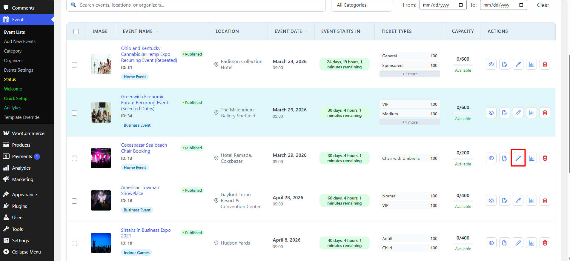 For that simply navigate to All Events and select the event you want to add the early bird discount.