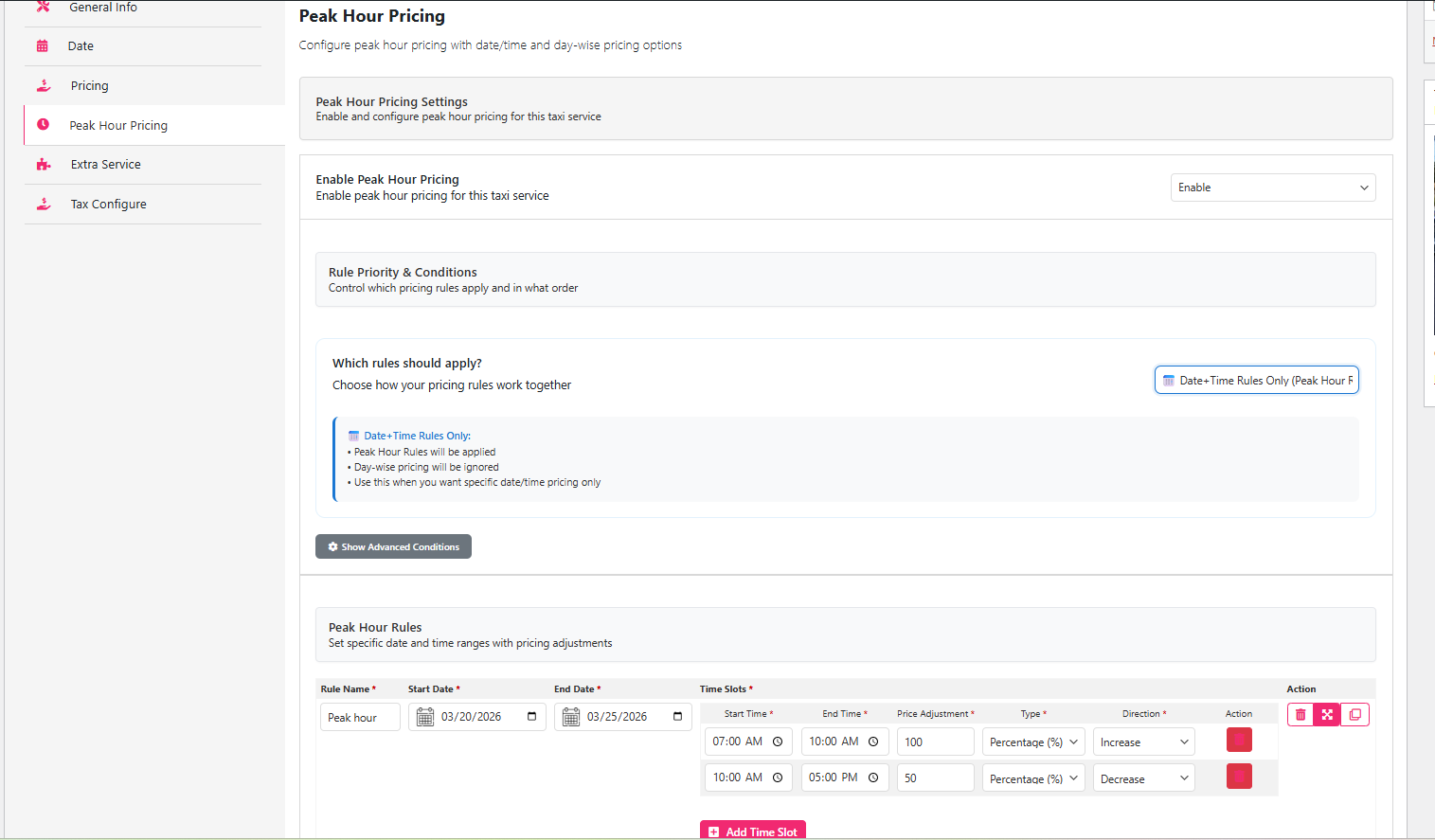 Purchase the Peak Hour Pricing Addon from MagePeople’s website or your eCab configuration.