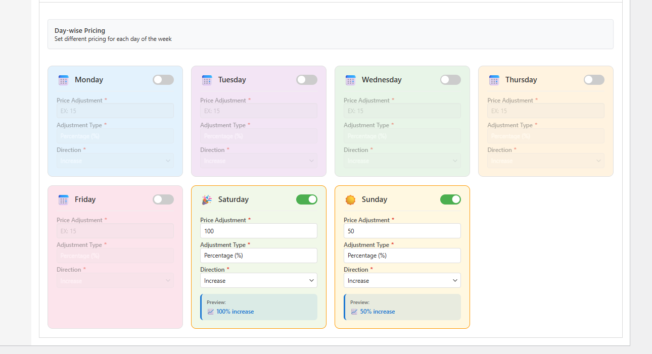For example, here Saturday is selected with a 100% increase in price for this car.