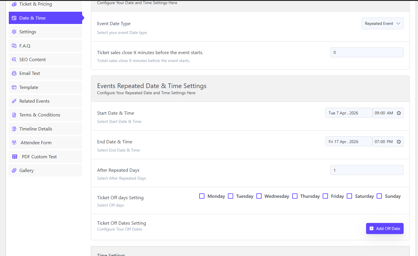 WpEvently’s Recurring Events Addon simplifies this by enabling you to create multiple date and time options within one event, ideal for ticketed events like appointments or classes.
