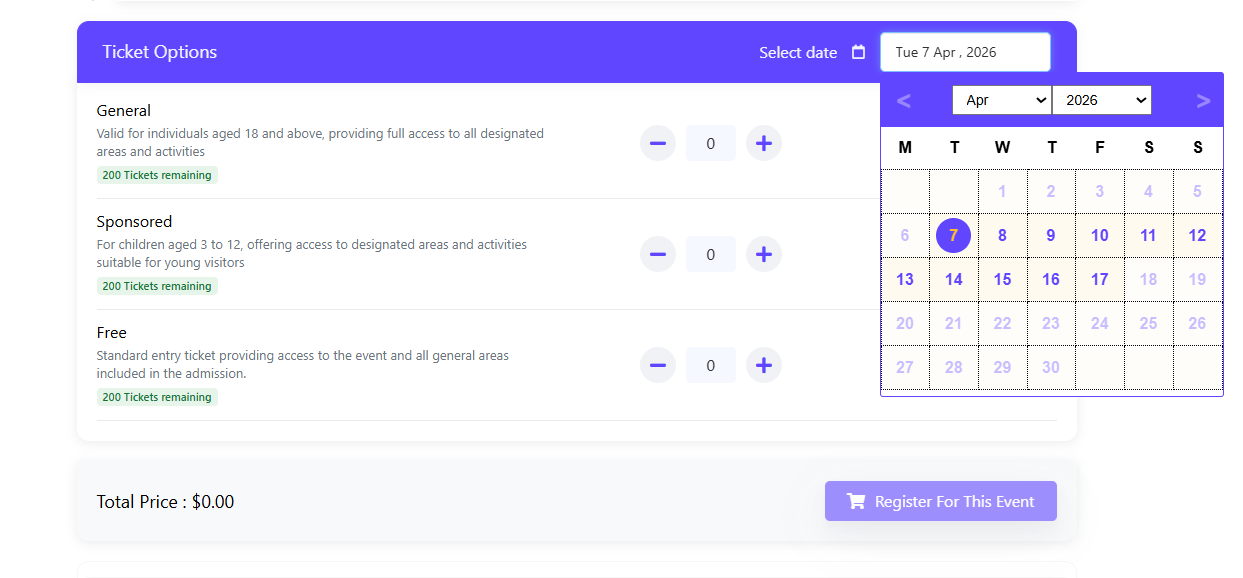 - Configure ticket availability and pricing for each event instance.