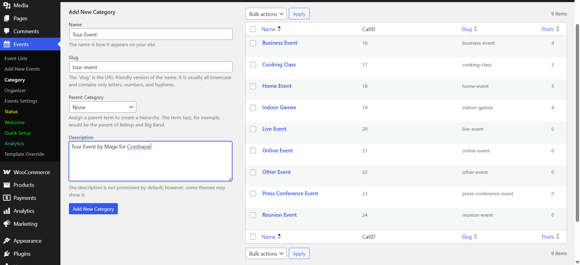 Before that, let’s create a category by clicking Events -> Category.