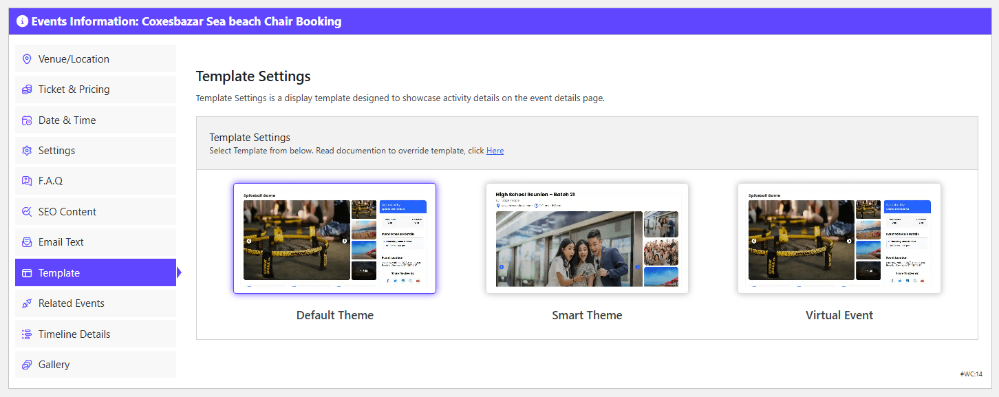 The Template tab in this management interface allows administrators to control the visual layout and “look and feel” of the public-facing event page. It essentially functions as a theme selector for individual event listings.