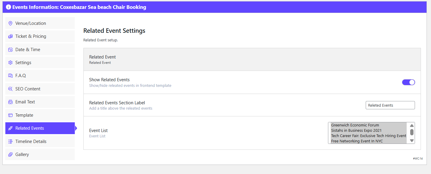The Related Events tab provides a way to cross-promote other listings on the current event page. This is a common strategy to increase user engagement and bookings by showing attendees other activities they might find interesting.