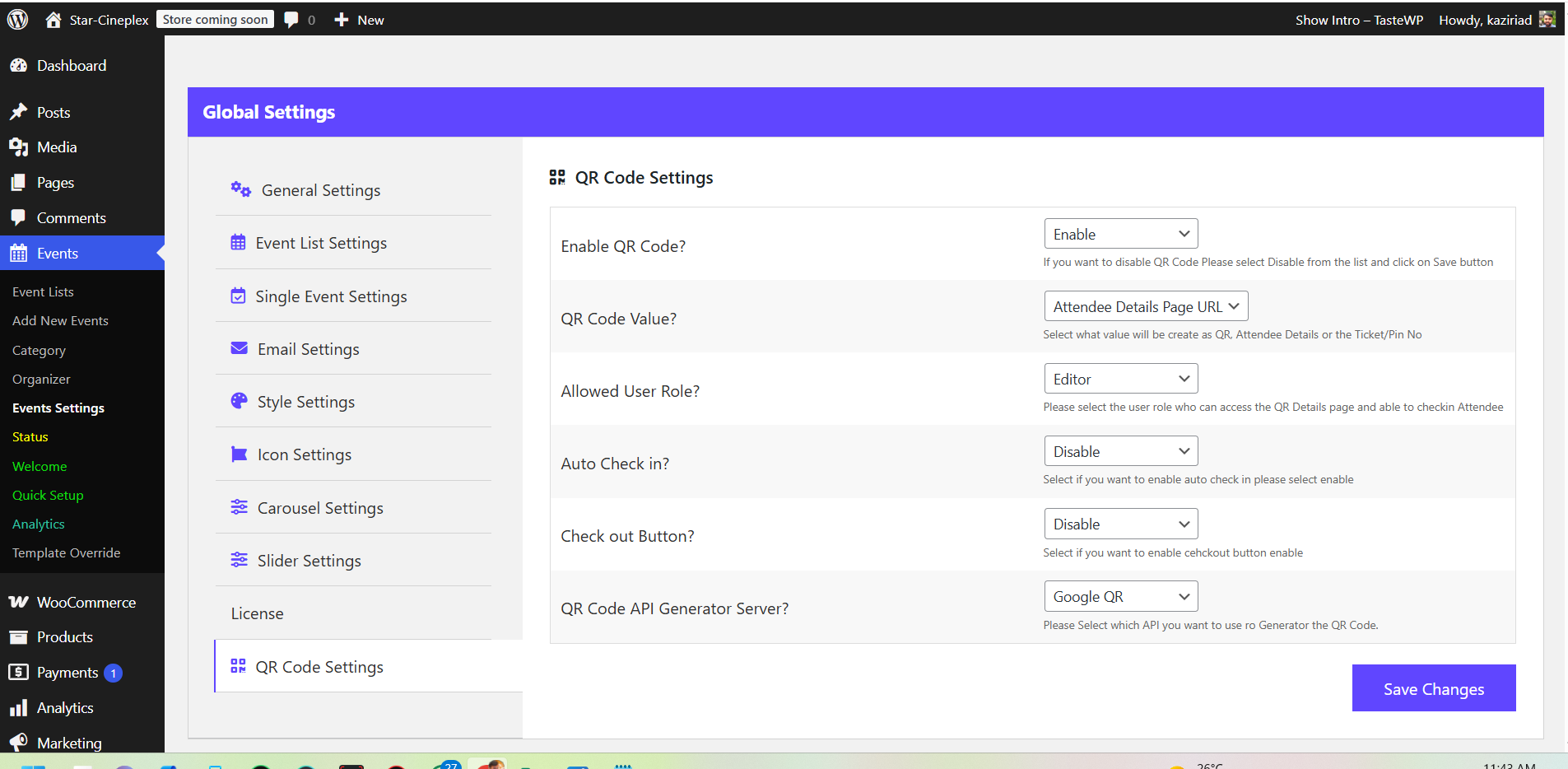 After activating it, click on “events” and go to “QR Code Settings.” Enable QR codes, and select the user roles.