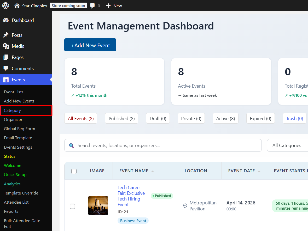 After putting in all the required info, click the “Add New Organizer” option to finalize it. Next, we’ll add a new category. So, click on “Category” under the “Events” section from your Dashboard.