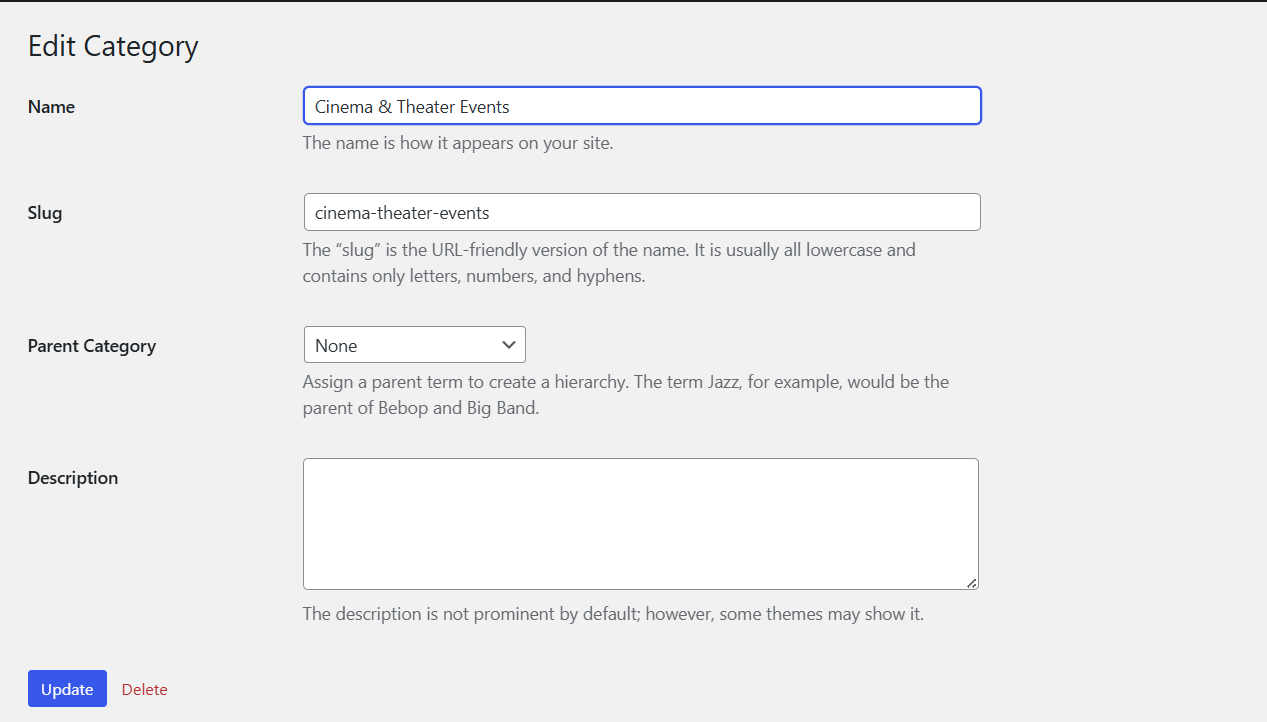 Type in the Organizer Name, Slug, and Parent Organizer. You can also add a small description with the detailed location or address info.