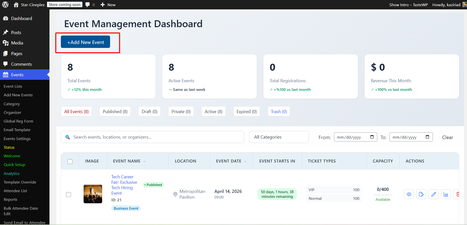 To add a new event, navigate your mouse pointer to the “Events” drop-down menu and click on the “Add New Event” option.