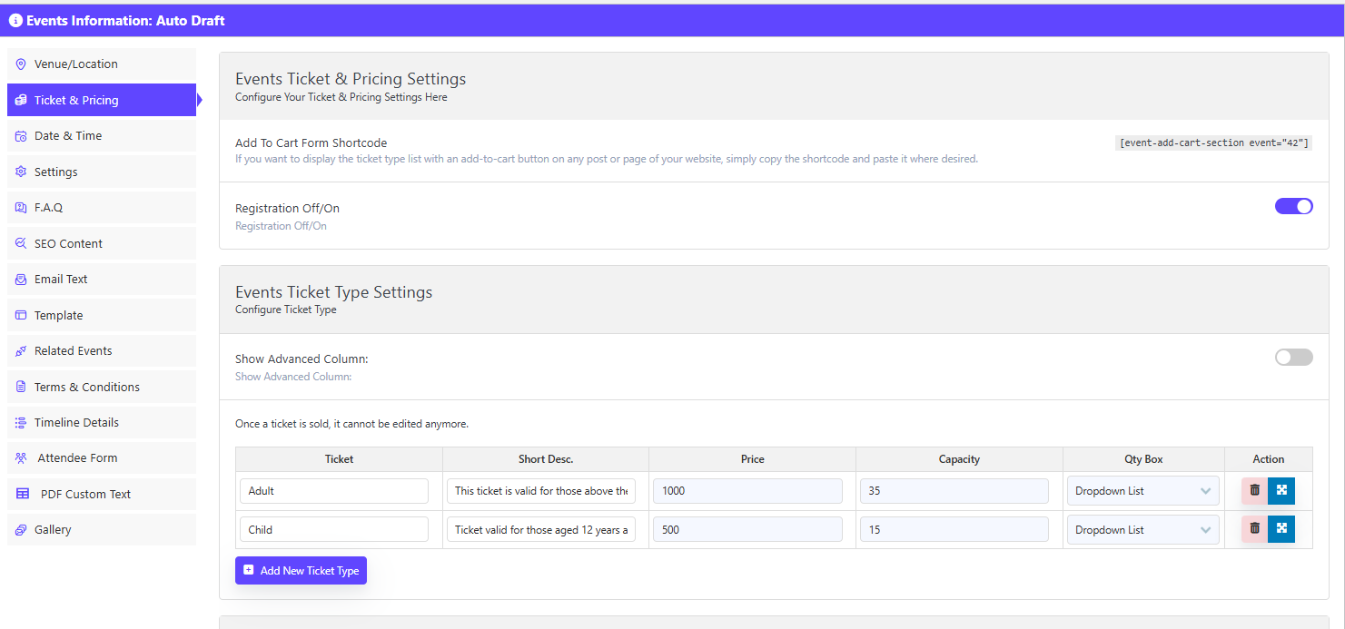 Move to the “Ticket & Pricing” section, where you’ll get a shortcode to add the tickets and pricing option anywhere. Click on the “Add New Ticket Type” to add a new ticket with price and capacity.