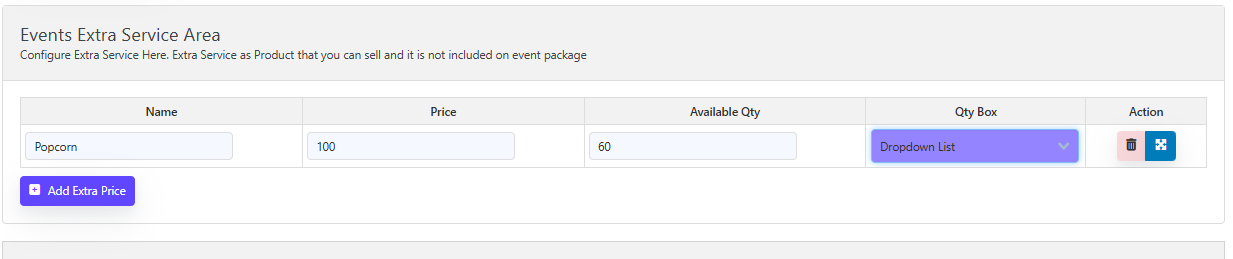 There is also an “Extra Service Area” section available underneath the “ticket & pricing” section where you can provide products to sell which are excluded from the ticket price.