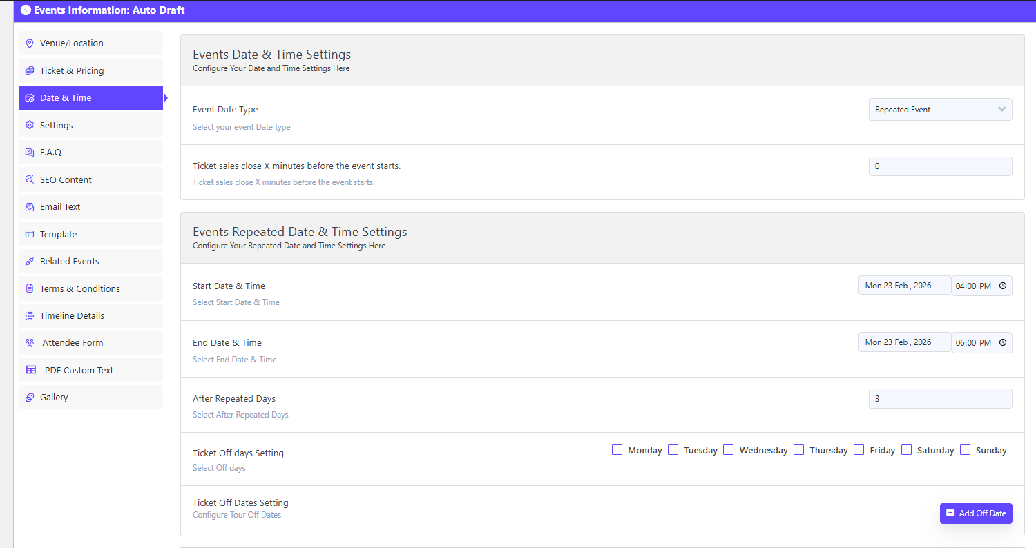 In the Date & Time section, you can add the event time and date with extended details. Since we’re building a theatre ticketing system, we’ll choose the repeated event option.