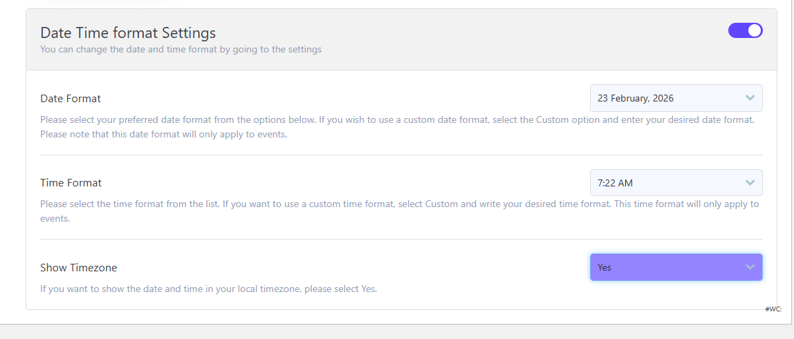Below, you’ll get a prolonged section for “Repeated Date & Time Settings” for recurring shows/events. You can also change the time format with the on/off button here.