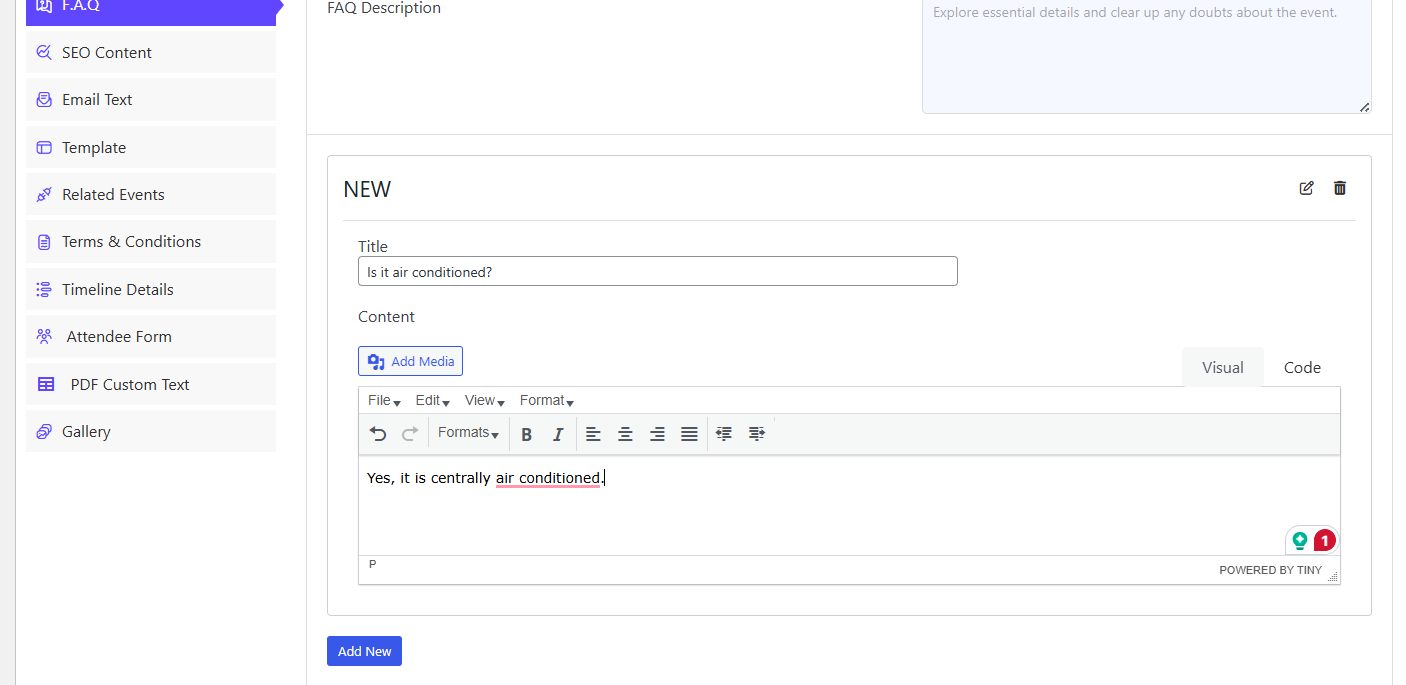 Since we’re creating a theatre booking system, we’ll skip the “Speaker Info” section. In the following section, you can add FAQs to help your clients with more details about your event.