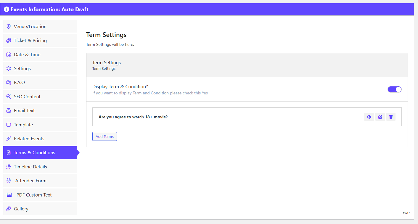 Then comes the “Terms & Conditions” section. If you want to display terms & conditions, you can modify this section. For new terms & conditions, click the “Add New Term & Condition” button.