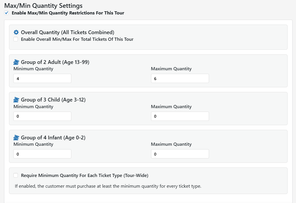 Yes, you can define global min/max limits for the whole tour as well as individual limits for each ticket type.