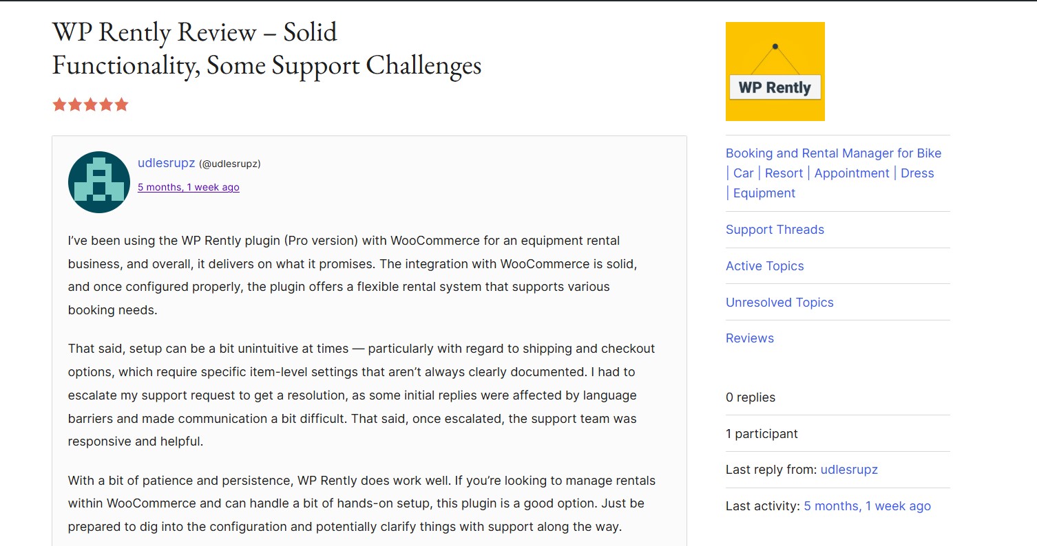 “The integration with WooCommerce is solid, and once configured properly, the plugin offers a flexible rental system that supports various booking needs.”